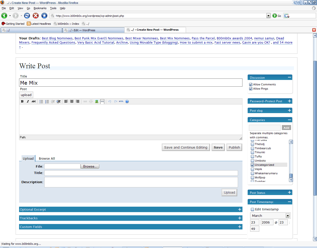 If you have six or more mixes posted on b00mb0x, we will give you a log in directly to the mix server if you email us at siteops at b00mb0x.org. No more waiting around for posting and if you want to post an prayer mix on Good Friday, you can (eww). It’s very easy, but like with anything, it might seem complicated at first glance. Someone can usually help you in the chat if you get stuck, hopefully this tutorial is crystal clear.